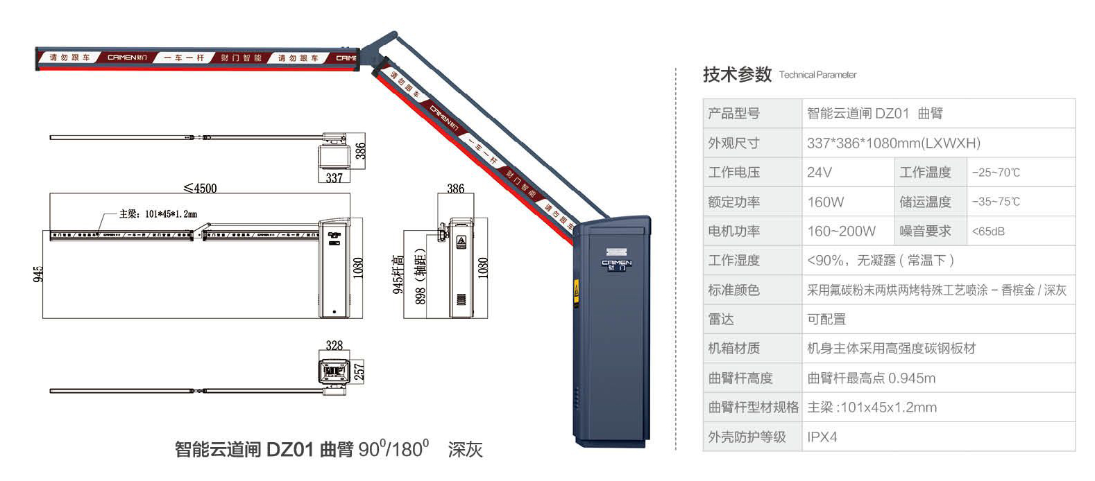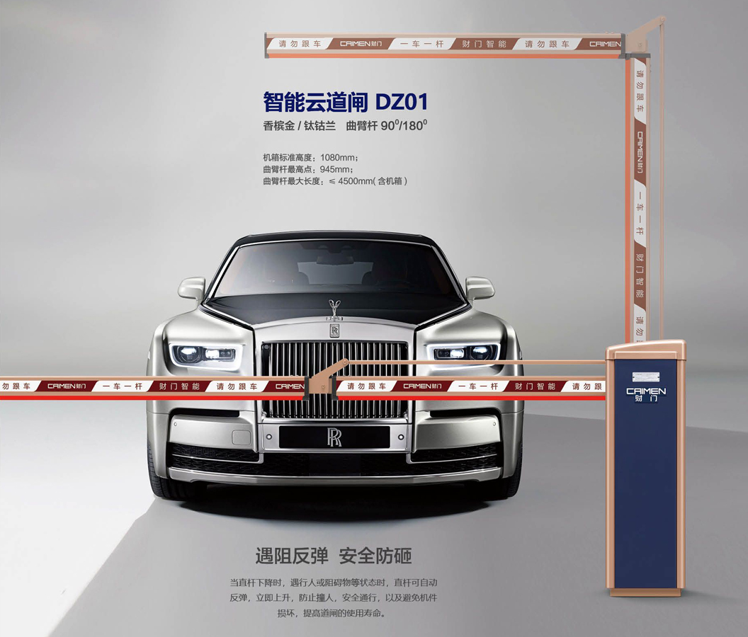 遇阻反弹 安全防砸。当直杆下降时,遇行人或阻碍物等状态时,直杆可自动反弹,立即上升,防止撞人,安全通行,以及避免机件损坏,提高道闸的使用寿命。