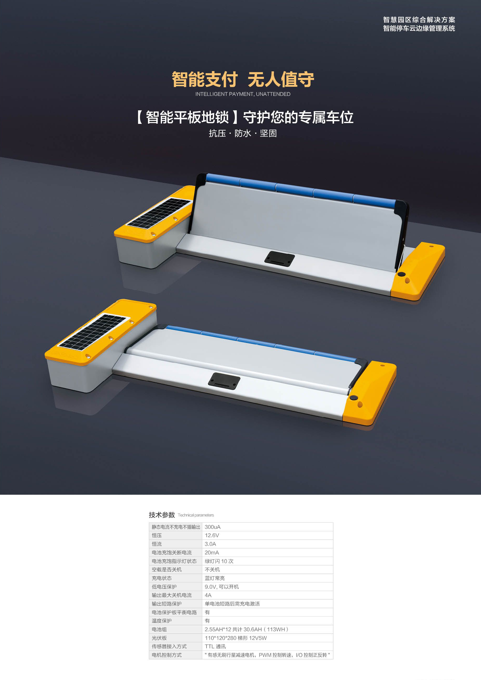 智能平板地锁采用太阳能+锂电池的方式供电,毋须搭接交流电拆装非常简单,免布线安装,不会破坏路面。即插即用,每个车位设备独立,可边安装边运营,快速获得效益。智能平板地锁的机箱和挡板采用全圆角设计。本产品同样采用双超声雷达检测、AI智能感应、物联网、云平台联网监控等先进科技。具备全天候无人值守、便捷支付等先进功能,有效规避了传统人工收费带来的整端,避免出现逃费、财务等各种漏洞。降本增效,为车位管理者带来实效与收益。本产品适用于停车场、新能源充电桩车位、街道街边停车位、以及零散车位等多种场合。